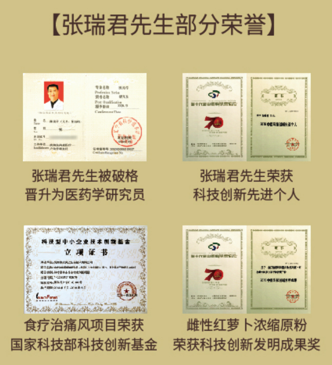 2020年,張瑞君先生因上述科研成果及科研成果轉(zhuǎn)化,被遼寧省科技廳和遼寧省人社廳破格晉升為醫(yī)藥學(xué)研究員,同時(shí)他還是正高級(jí)農(nóng)藝師,張瑞君先生是遼寧省第一位在兩個(gè)領(lǐng)域擁有高級(jí)職稱的高級(jí)技術(shù)人員,同年,他被沈陽(yáng)市人社局評(píng)選為“高層次人才”。